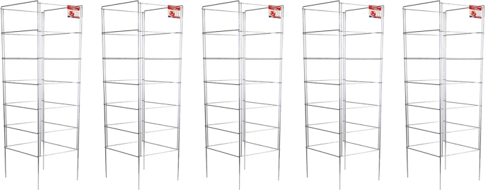 Pack Size: Pack of 5 Heavy Duty Tomato Cage Our heavy-duty, steel Tomato Cages are much taller and stronger than the old-fashioned, cone-shaped supports and are strong enough to support your biggest plants. Use them for tomatoes, eggplants, peppers, and any other plants that produce large fruit and need support. The square towers easily push deep into the ground, so you won’t have to worry about them falling over as a result of the wind. These Tomato Cages support the plant on all sides with no tying needed. Keeping plants off the ground provides better air circulation, cleaner fruit, and less disease. Large 8” openings in the cages make harvesting easy and the towers fold flat for space-saving storage once the growing season ends. Made of durable, 8 gauge galvanized wire that will last for many growing seasons to come. You will love our Heavy-Duty tomato cages. We are 100% sure! Our cages are strong and sturdy providing you with years and years of plant support.